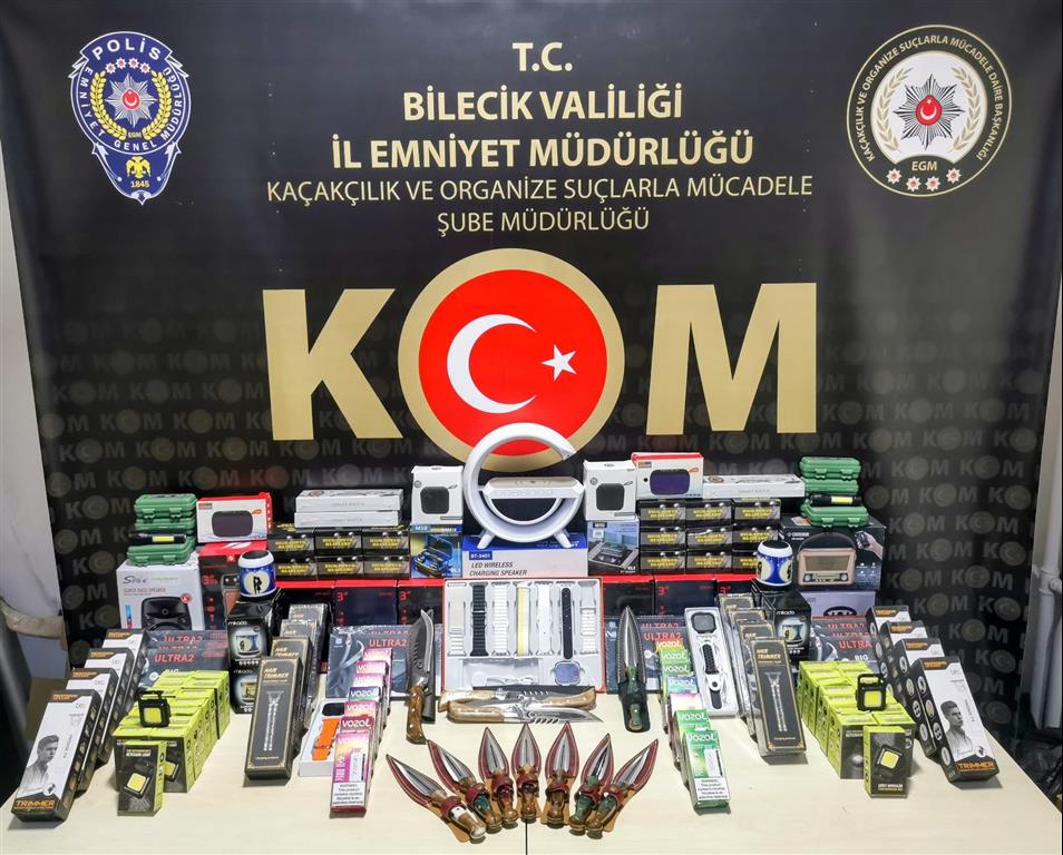 Bu kapsamda, Bozüyük ilçesinde gümrük kaçağı 14 elektronik sigara, 22 kablosuz hoparlör, 17 akıllı saat, 3 kulaklık, 2 radyo, 16 tıraş makinesi, 46 şarjlı lamba, 8 el feneri ile 12 bıçak ve masaüstü şarj standı ele geçirildi.