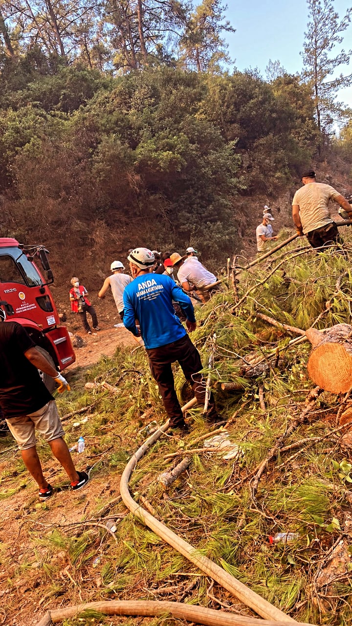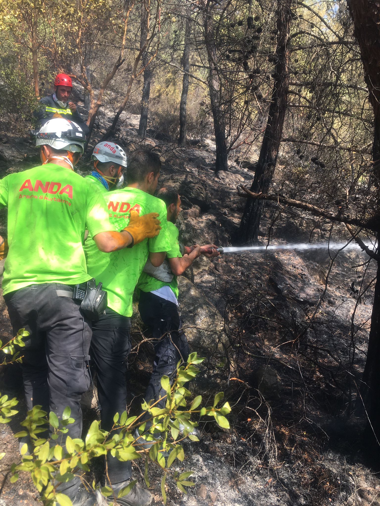 9 kişi ile yangın bölgesinde görev alan ANDA ekibi, burada yangın söndürme, tahliye, müdahale ve çadır kurulum görevlerini üstleniyor.