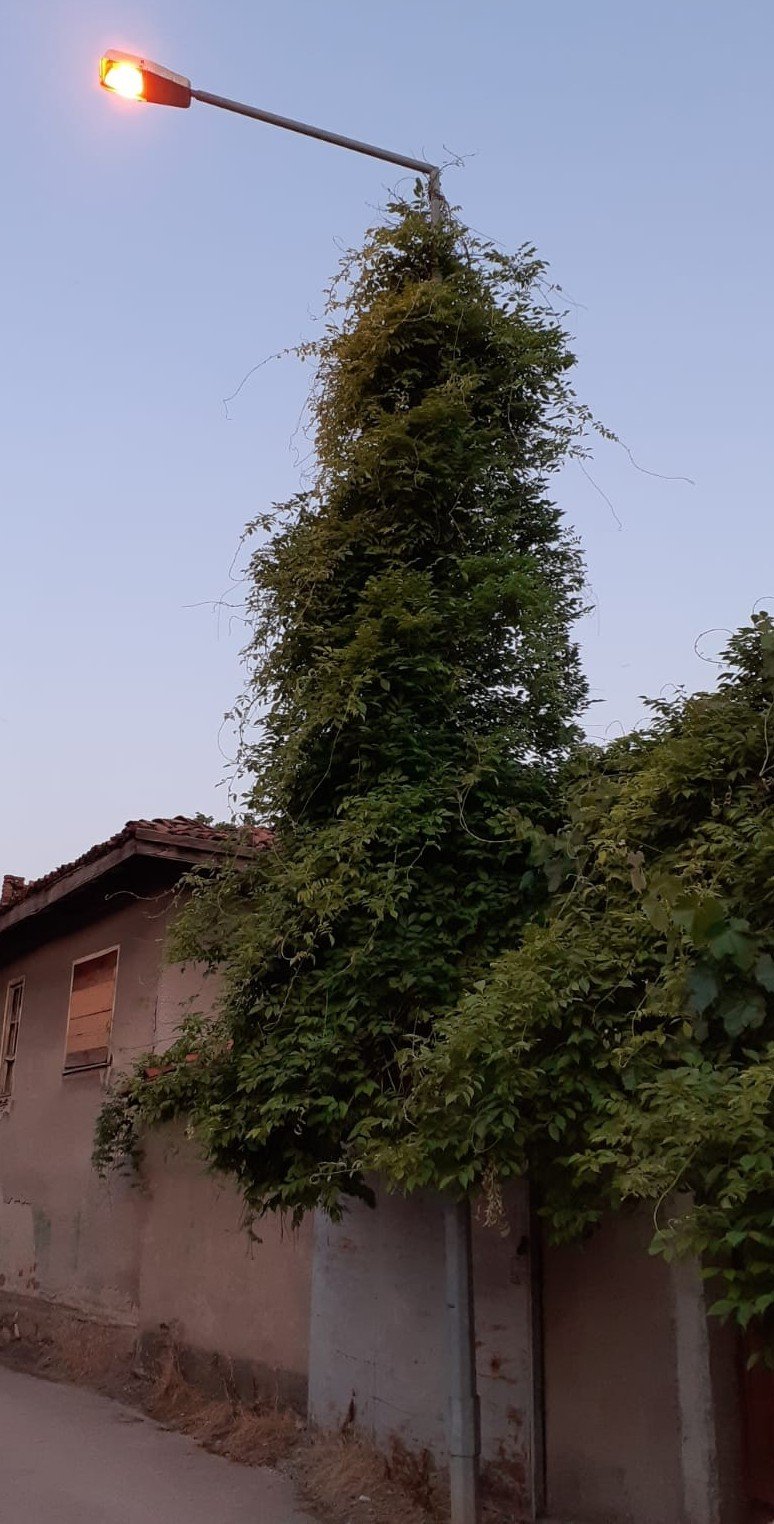 Bilecik’in Bozüyük ilçesinde bir evin bahçe duvarı dibinde bulunan sokak aydınlatma direğini saran sarmaşığı görenler şaşkınlıklarını gizleyemiyorlar.