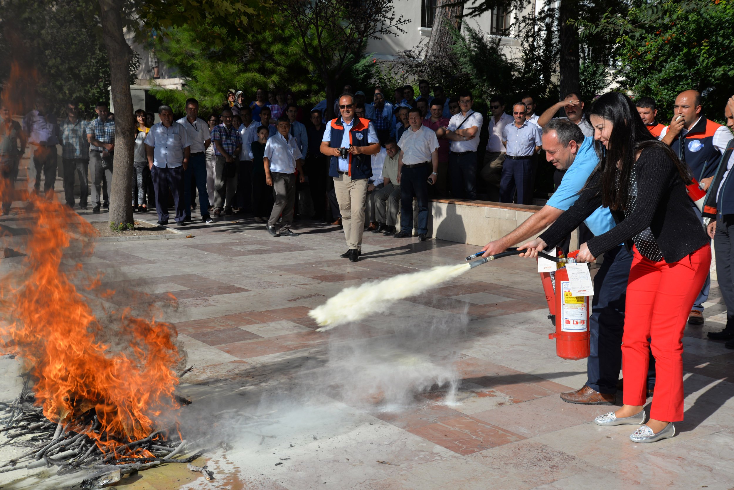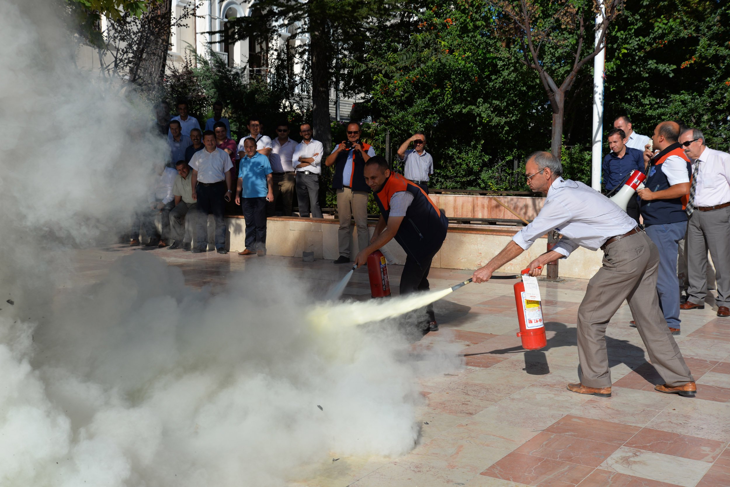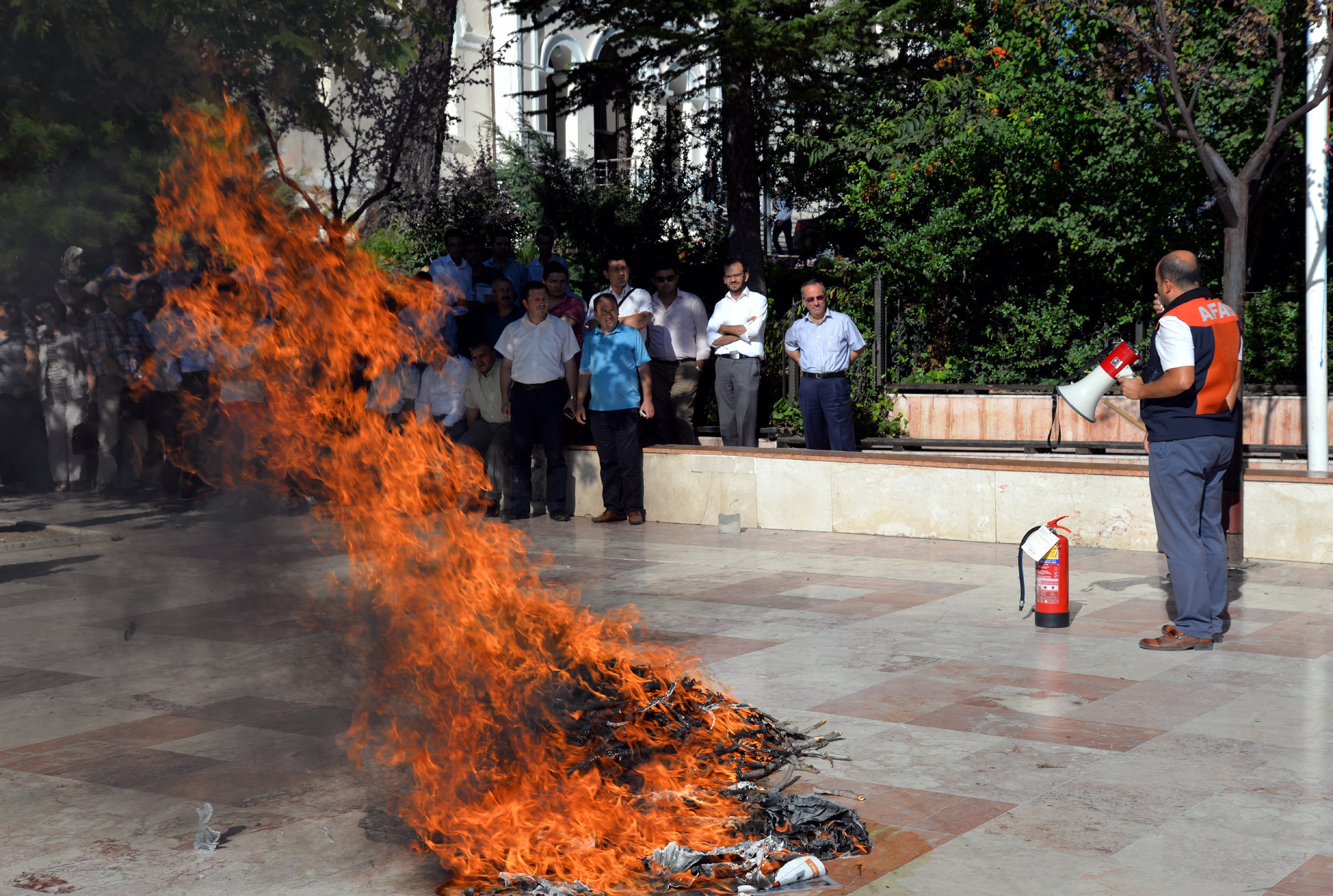 Eğitimin ardından temsili olarak Hükümet Konağında yangın alarmı verilerek yangın anında yapılması gerekenler, bir tatbikatla gösterildi. Tatbikat, Cumhuriyet Meydanı’nda yakılan ateşle devam etti. Tatbikatta, ilk olarak yangın ekiplerinde görevlilere, yangın tüpleri doldurularak yanan ateşi nasıl söndürüleceği ve müdahale edileceği gösterildi.