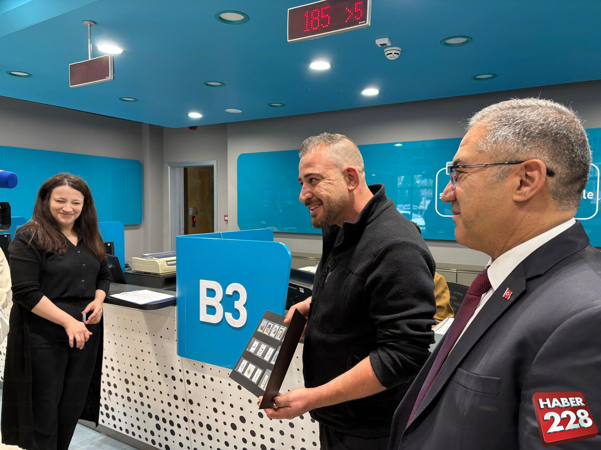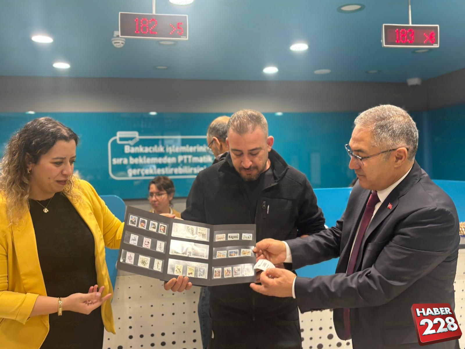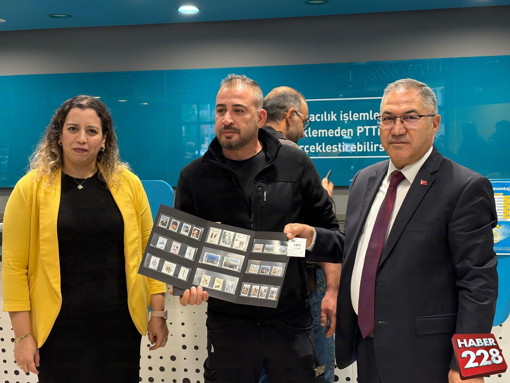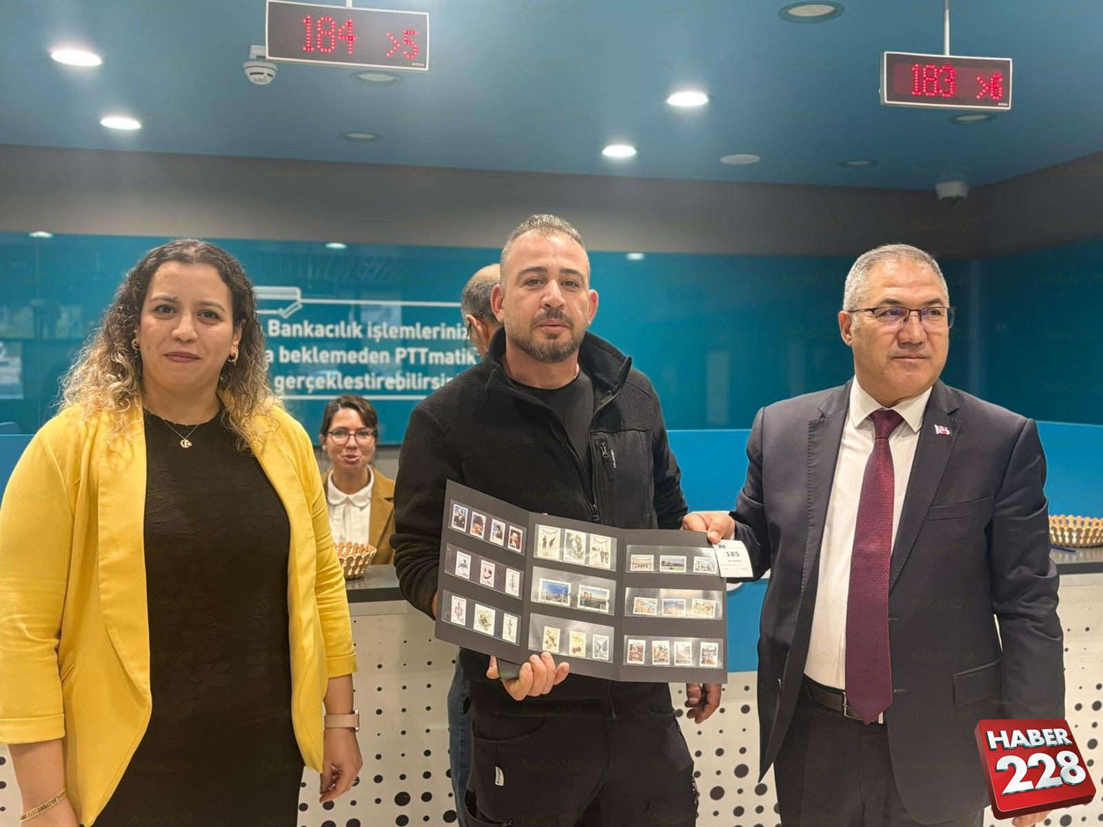 Başmüdür Bozkurt, daha sonra günün 185’inci müşterisi Yalçın Duran’a pul koleksiyonu hediye etti.