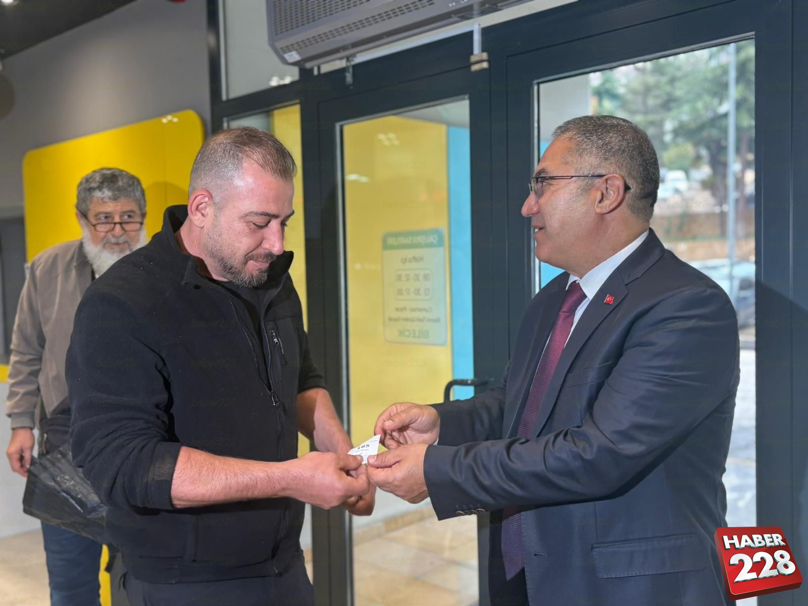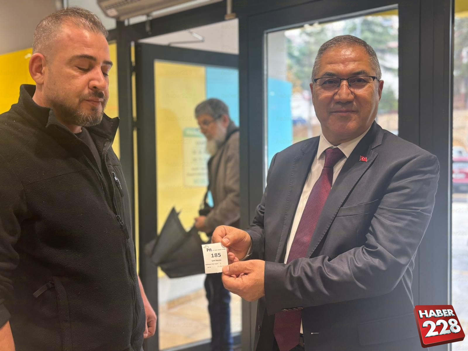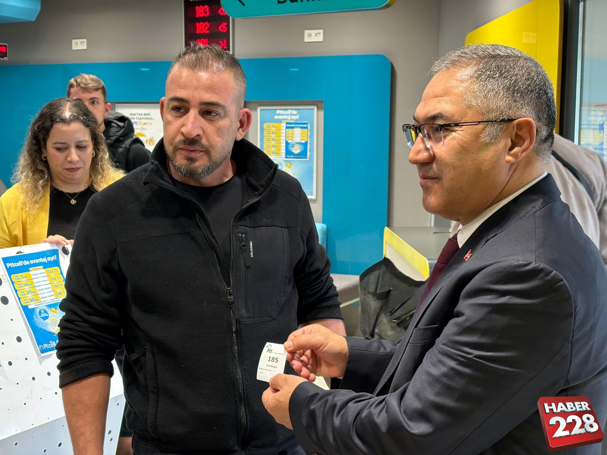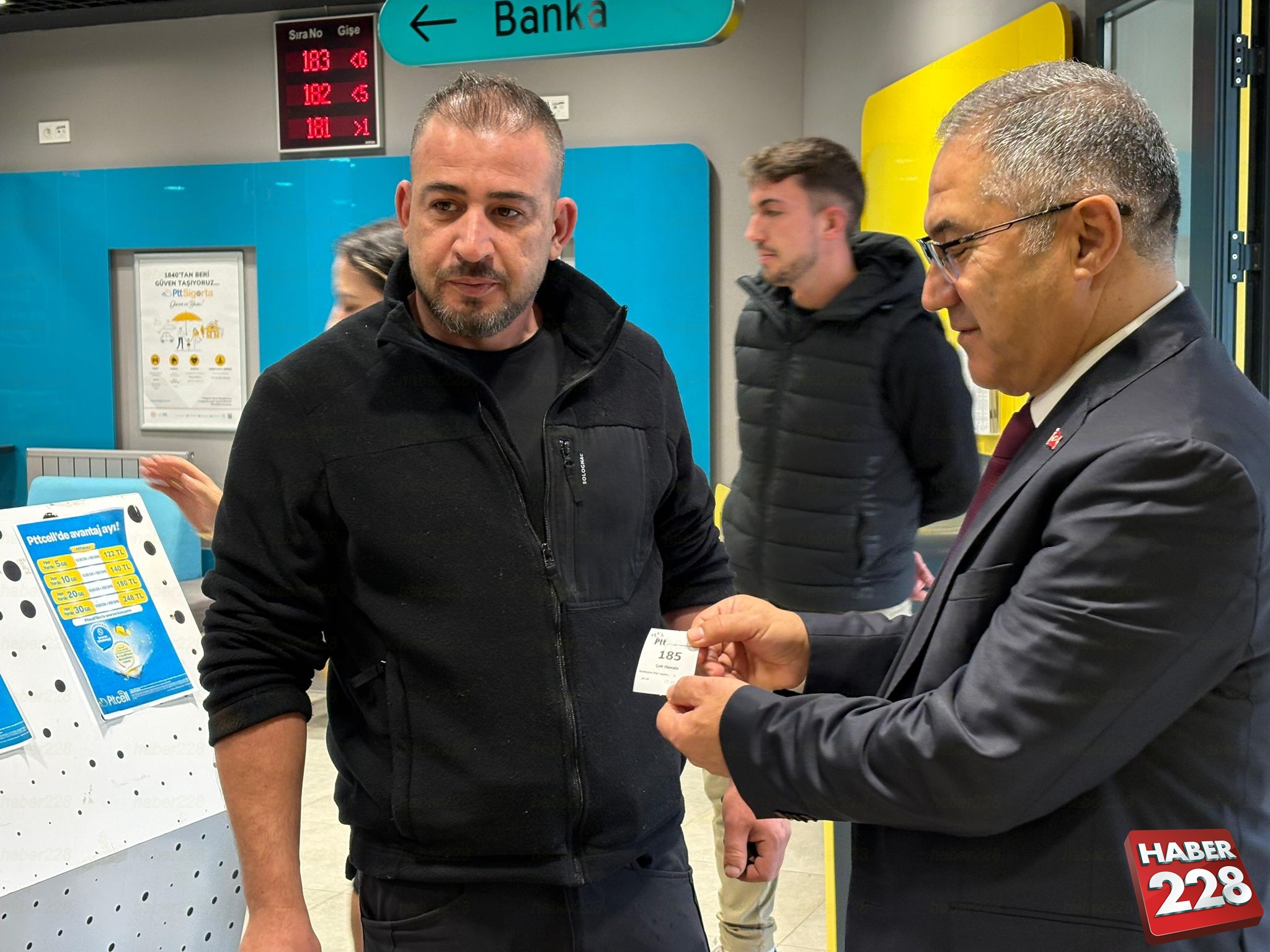 Başmüdür Bozkurt, daha sonra günün 185’inci müşterisi Yalçın Duran’a pul koleksiyonu hediye etti.