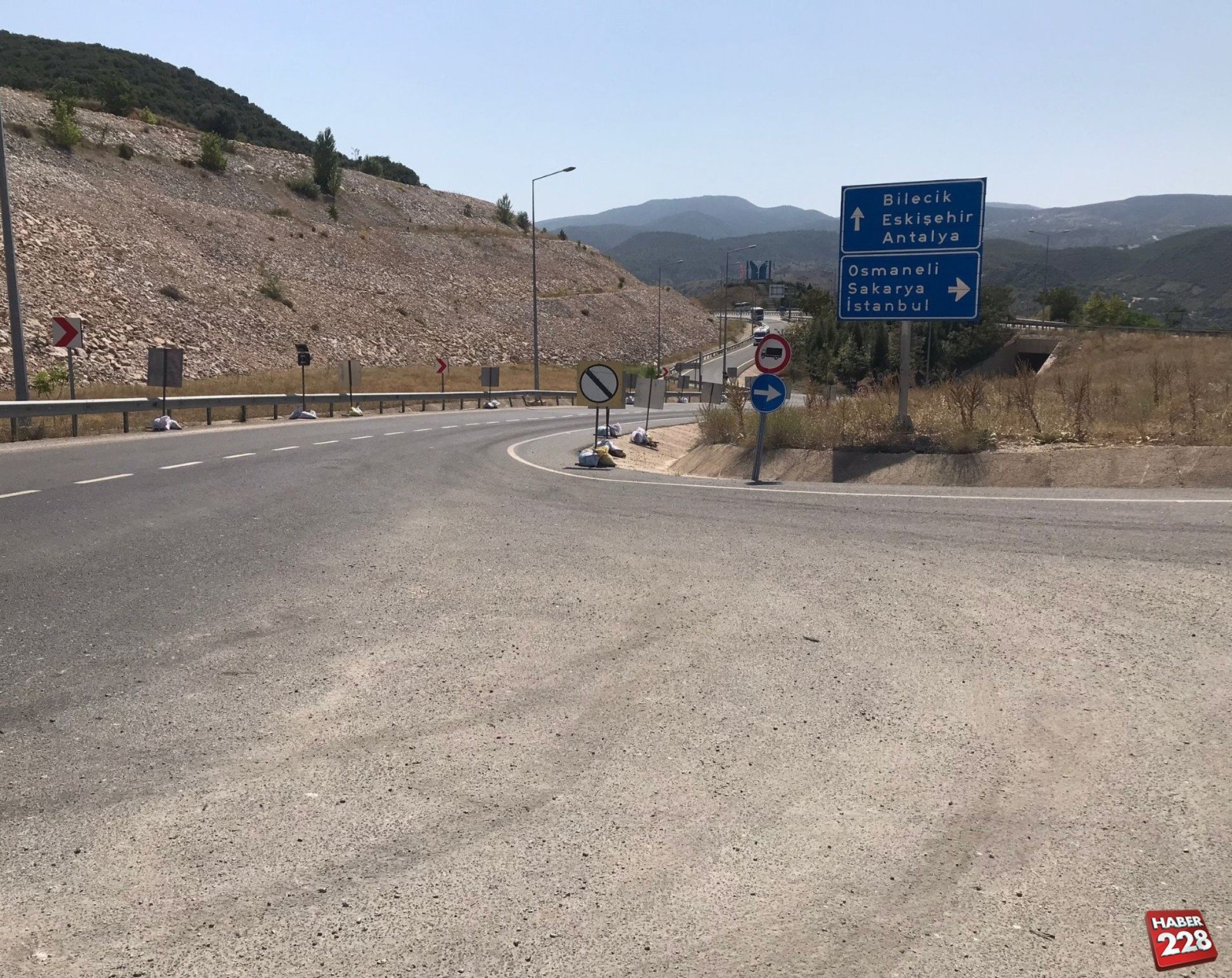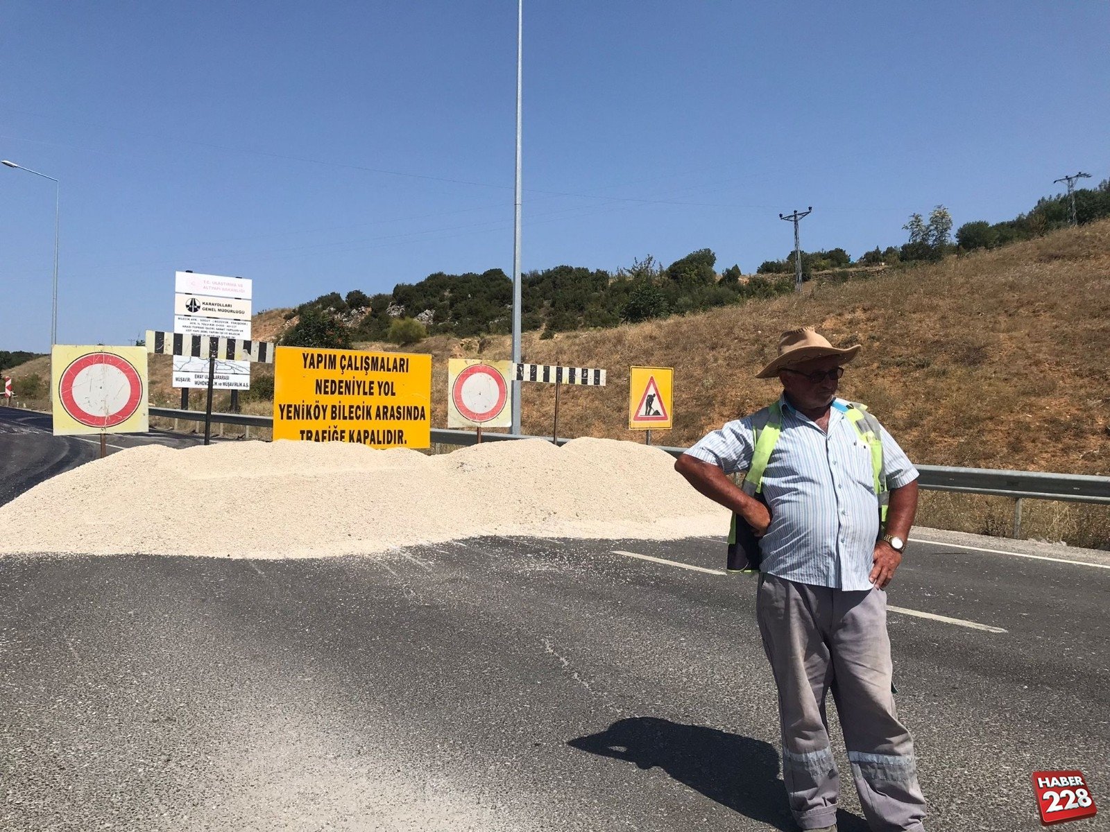Yola mıcır döken yetkiler, ’Yapım çalışmaları nedeniyle yol Yeniköy-Bilecik arası trafiğe kapalıdır’ yazılı tabela koydu.