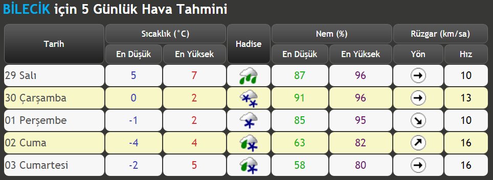 Son günlerde soğuk havanın etkisine giren Bilecik’te bugünden itibaren kar yağışı bekleniyor. Meteoroloji İşleri Genel Müdürlüğü’nün verilerine göre, Çarşamba, Perşembe, Cuma ve Cumartesi kar yağışı gözlenirken, sıcaklıklar da sıfır ile eksi 4’e düşecek. Yarın kuvvetli yağışlı bir hava tahmin edilirken, aynı günü takip eden Çarşamba ve Perşe günleri kar yağışlı, Cuma ve Cumartesi günleri ise karla karışık yağmur bekleniyor.