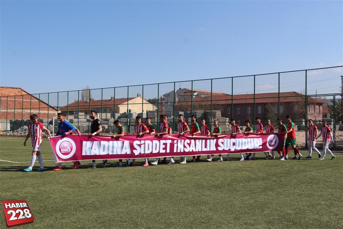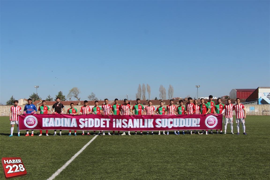Grupta 2. hafta müsabakaları kapsamında Pazaryeri İlçe Stadı’nda karşılaşan iki takımın futbolcuları, “Kadına şiddet insanlık suçudur” pankartıyla sahaya çıktı.