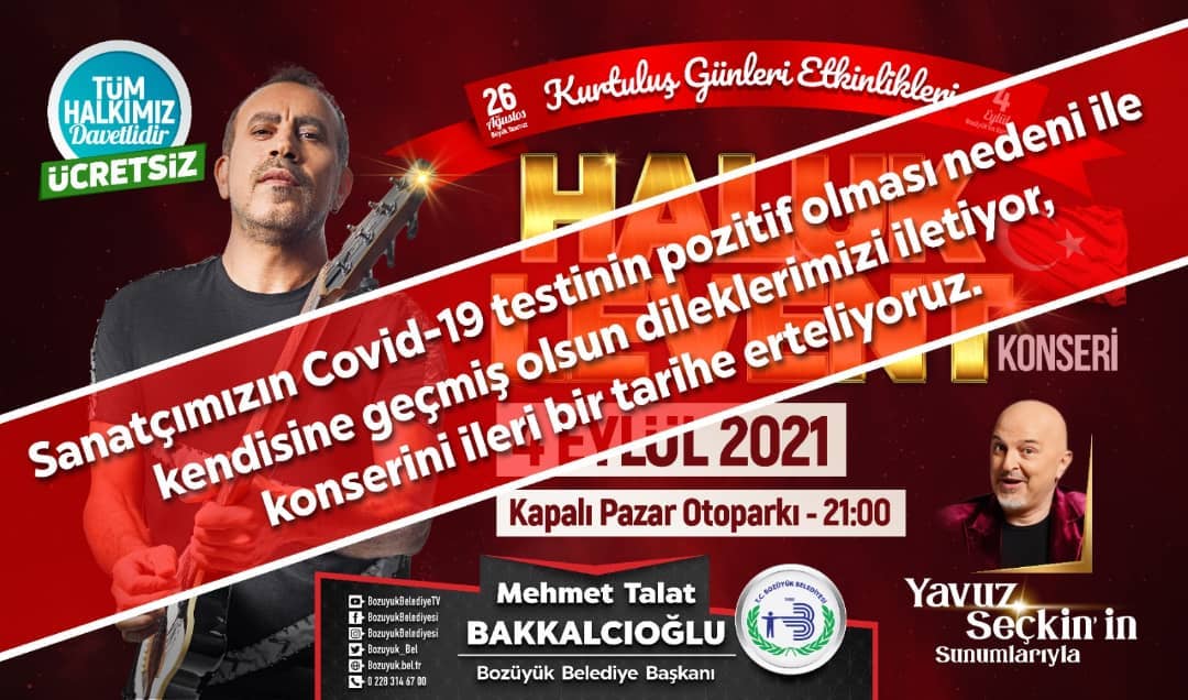 Bozüyük Belediyesi tarafından “Kurtuluş Günleri Etkinlikleri” kapsamında 4 Eylül 2021 Cumartesi günü Kapalı Pazar Otopark alanında düzenlenmesi planlanan Haluk Levent Konseri, sanatçının Covid-19 testinin pozitif çıkması nedeniyle ileri bir tarihe ertelendi.