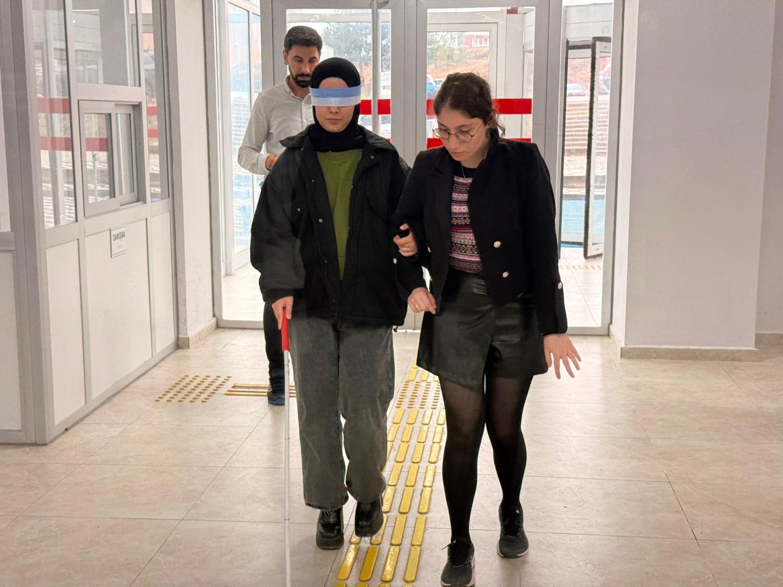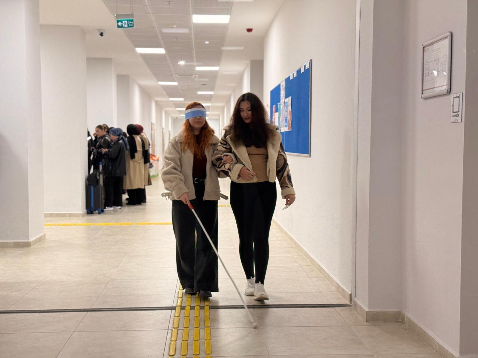 Bilgilendirmenin ardından öğrencilere göz bandı ve beyaz baston kullanarak kısa bir parkurda yön bulma deneyimi yaşatıldı. Katılımcılar, bu deneyim sayesinde görme engelli bireylerin günlük yaşamda karşılaştıkları zorlukları fark etme ve empati kurma fırsatı buldu.