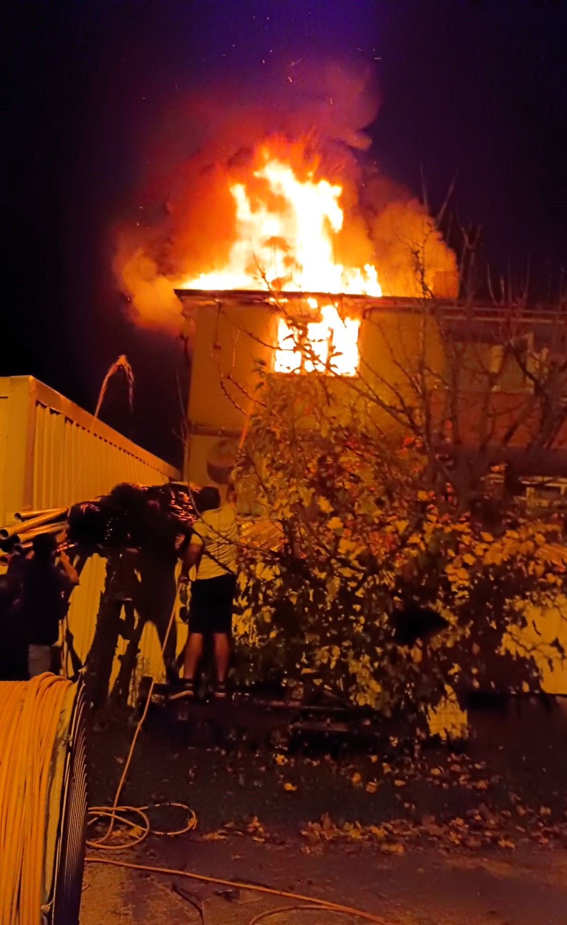 İtfaiye ekiplerinin müdahale ederek söndürdüğü yangın nedeniyle binanın çatısında hasar oluştu. – AA