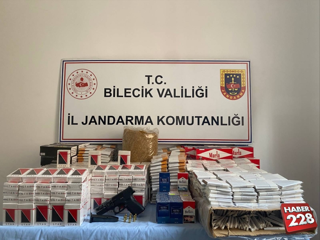 Yapılan aramalarda ruhsatsız tabanca ve şarjör, 30 bin 160 dolu ve boş makaron, 5 kilogram kıyılmış tütün ve 230 boş sigara paketi ele geçirildi.