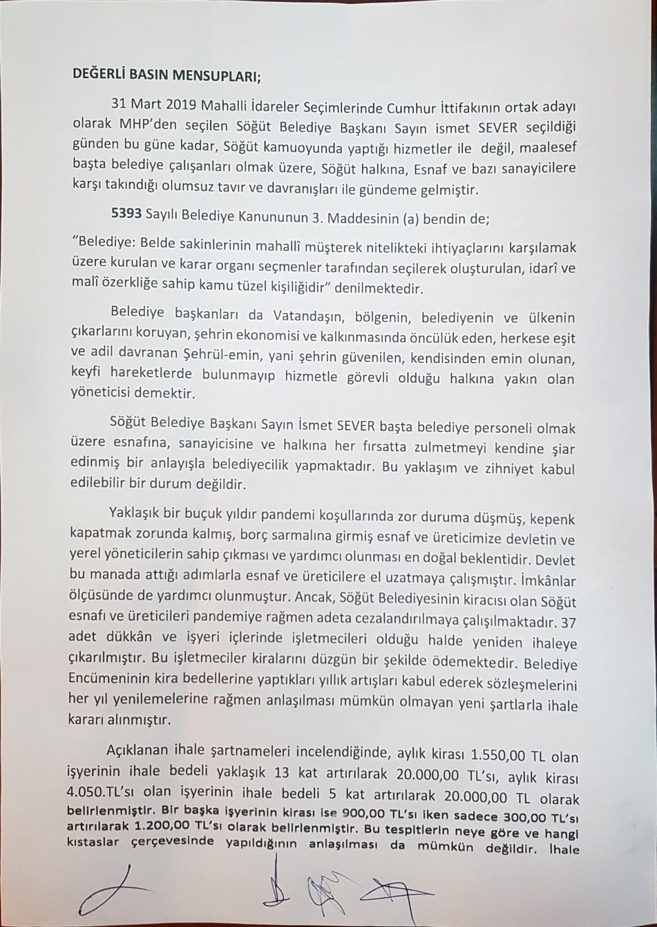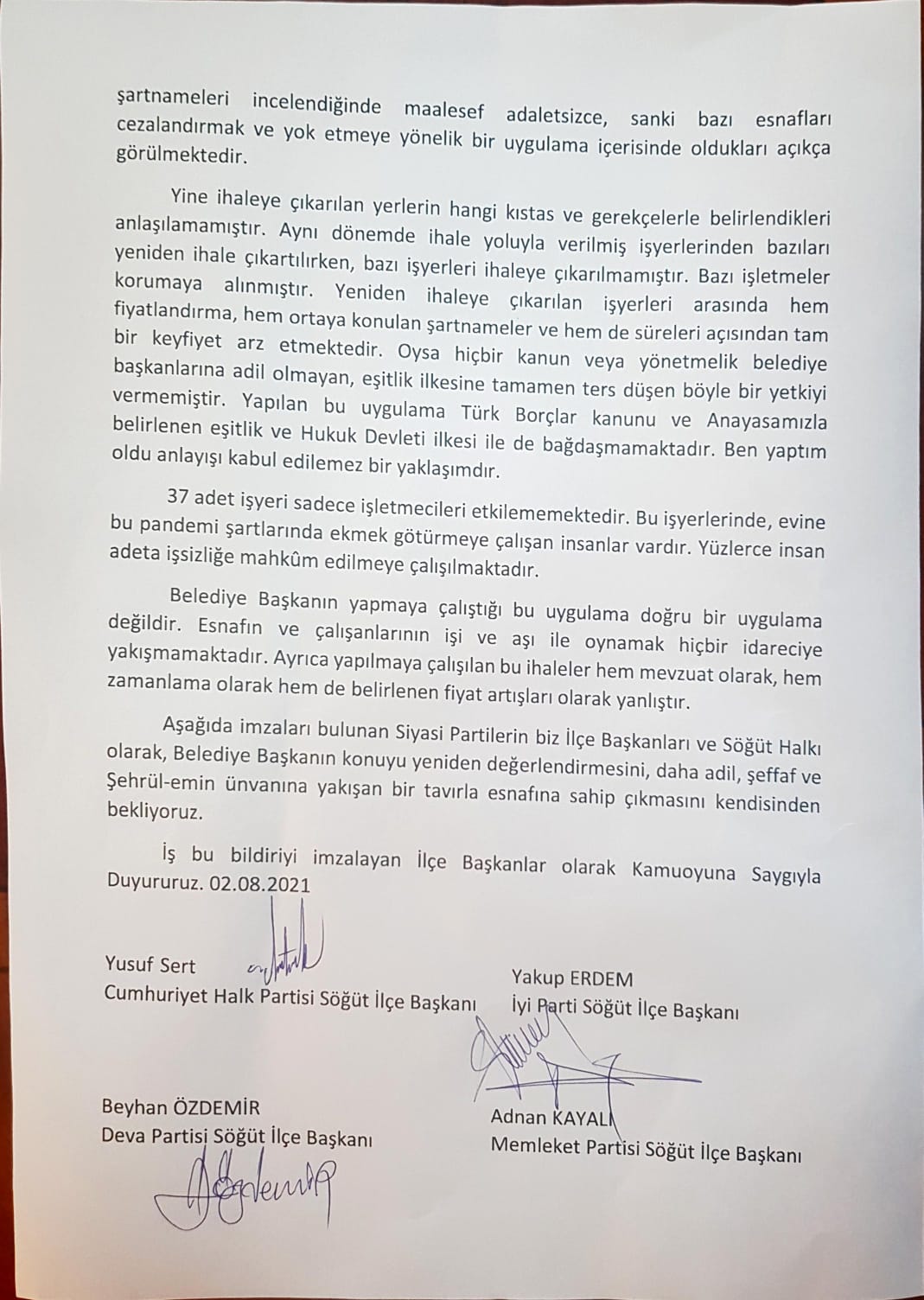 Aşağıda imzaları bulunan Siyasi Partilerin biz İlçe Başkanları ve Söğüt Halkı olarak, Belediye Başkanın konuyu yeniden değerlendirmesini, daha adil, şeffaf ve Şehrül-emin ünvanına yakışan bir tavırla esnafına sahip çıkmasını kendisinden bekliyoruz.”