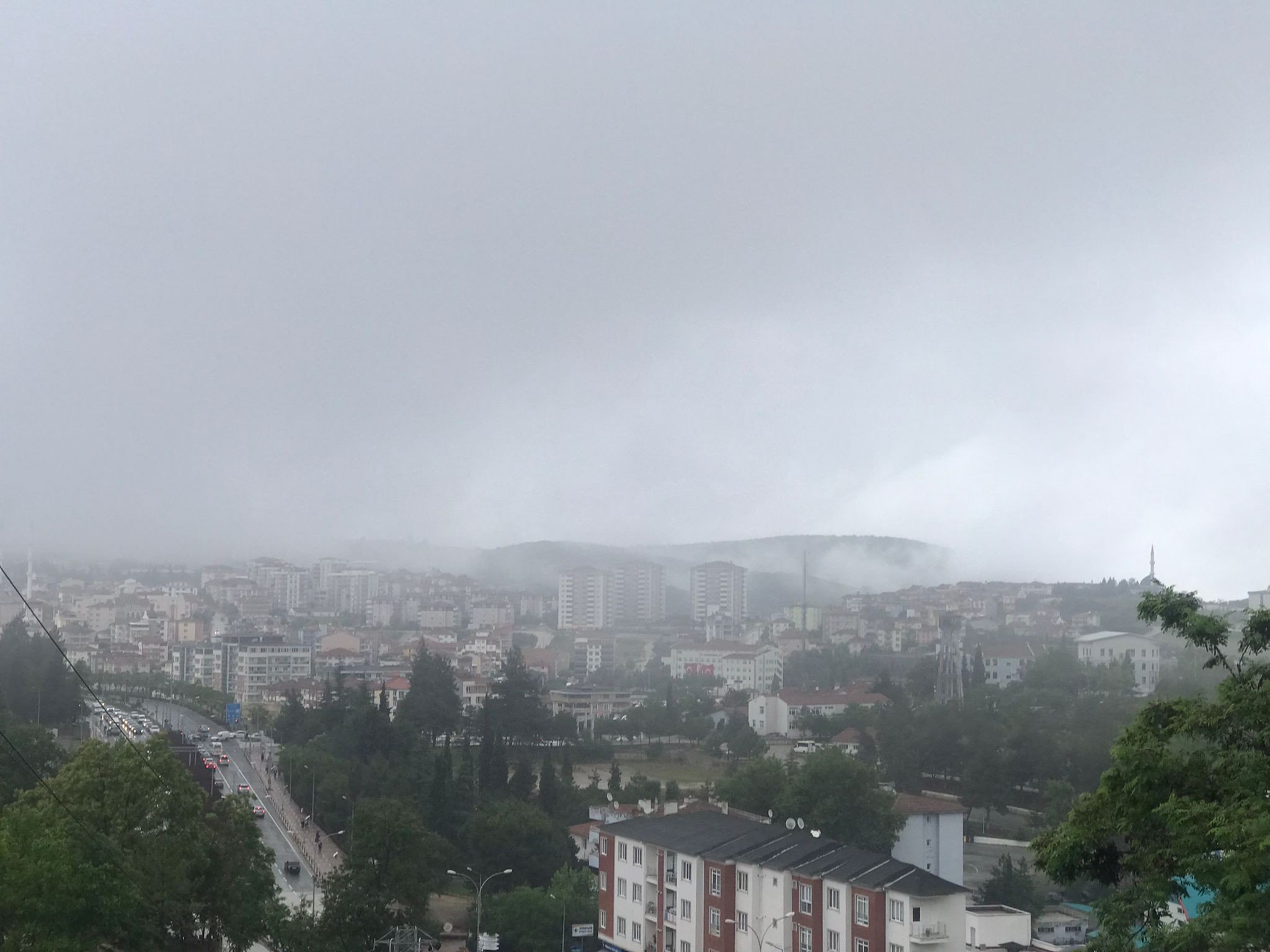 Bilecik kent merkezinde devam eden sağanak yağışının ardından yüksek kesimleri adeta sis kapladı.