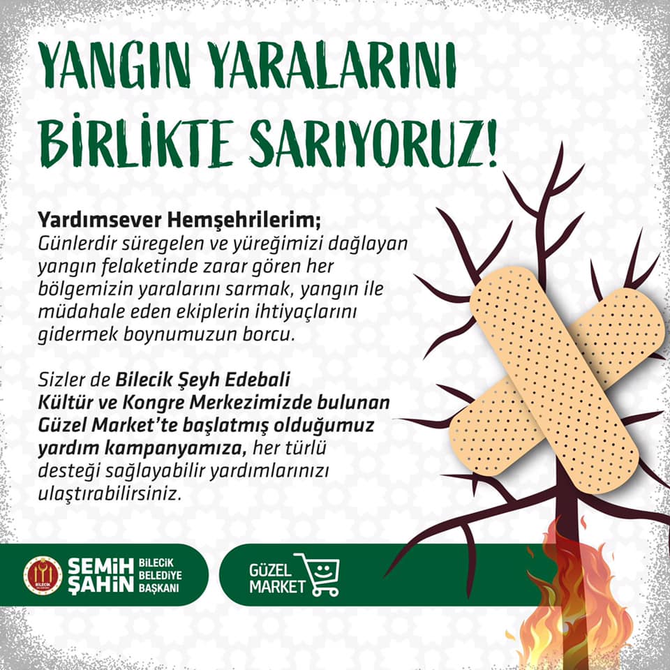 Şahin yaptığı yazılı açıklamada “Başlatılan yardım kampanyası ile günlerdir devam eden yangında mağdur olan vatandaşların yaralarını saracağız. ‘Yangın yaralarını birlikte sarıyoruz’ sloganı ile başlattığımız kampanyaya bütün vatandaşlarımız her türlü desteği sağlayabilecek. Şeyh Edebali Kültür ve Kongre Merkezinde bulunan Güzel Markete yapılacak yardımlar, yangından zarar gören ihtiyaç sahiplerine ulaştırılacak. Günlerdir devam eden ve yüreğimizi dağlayan yangın felaketinde zarar gören her bölgemizin yaralarını sarmak, yangın ile mücadele eden ekiplerin ihtiyaçlarını gidermek boynumuzun borcudur. Sizler de Bahçelievler Mahallesinde yer alan Bilecik Belediyesi Şeyh Edebali Kültür ve Kongre Merkezinde bulunan Güzel Markette başlatmış olduğunuz yardım kampanyamıza her türlü desteği sağlayabilir, yardımlarınızı ulaştırabilirsiniz’’ ifadeleri kullanıldı.