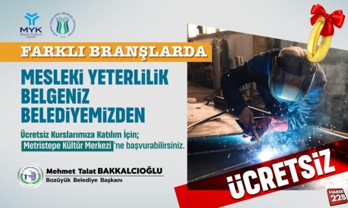 Bozüyük Belediyesi ile Sakarya Uygulamalı Bilimler Üniversitesi Yaşam Boyu Eğitim Merkezi işbirliği ile çeşitli branşlarda başlayacak Mesleki Yeterlilik kurslarında başarılı olanlara verilecek sertifikalar ile kursiyerlerin daha kolay iş bulmaları amaçlanıyor. Bozüyük Belediyesi tarafından ücretsiz olarak yapılacak kurslara 18 yaş ve üzeri yaştakiler ile daha önceden teşvik kapsamında Mesleki Yeterlilik Kursu belgesi almamış vatandaşlar başvurabilecek. Kurslara katılmak isteyen adaylar, Bozüyük Belediyesi Metristepe Kültür Merkezi’nde form doldurarak kayıtlarını oluşturabilirler.