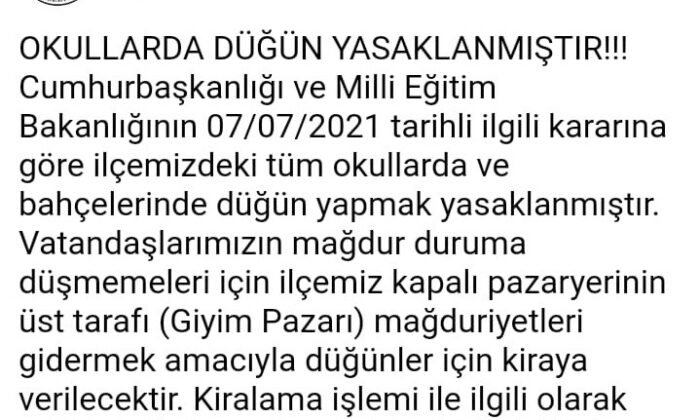 Belediye Başkanlığı’ndan yapılan duyuruda, Cumhurbaşkanlığı ve Milli Eğitim Bakanlığı’nın kararları üzerine tüm okullarda ve bahçelerinde düğün yapmanın yasaklandığı belirtildi. Vatandaşları mağdur duruma düşmemeleri için ilçedeki kapalı pazar yerinin üst tarafının düğünler için kiraya verileceği anlatılan açıklamada, Bakanlık tarafından alınan karar ise şöyle belirtildi;