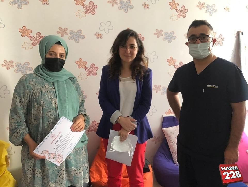Gebe Okulu programı ile, 2021 Yılı 1. dönem Gebe Okulu mezunu anne adaylarına Hastane Başhekimi Op. Dr. İlhan Zencirci, Sağlık Bakım Hizmetleri Müdürü Yasemin Eren, Kadın Doğum Hastalıkları Uzmanı Dr. Elif Ilgazi ve Gebe Okulu Sorumlusu Ebe Fatma Yılmaz tarafından katılım belgeleri verildi.