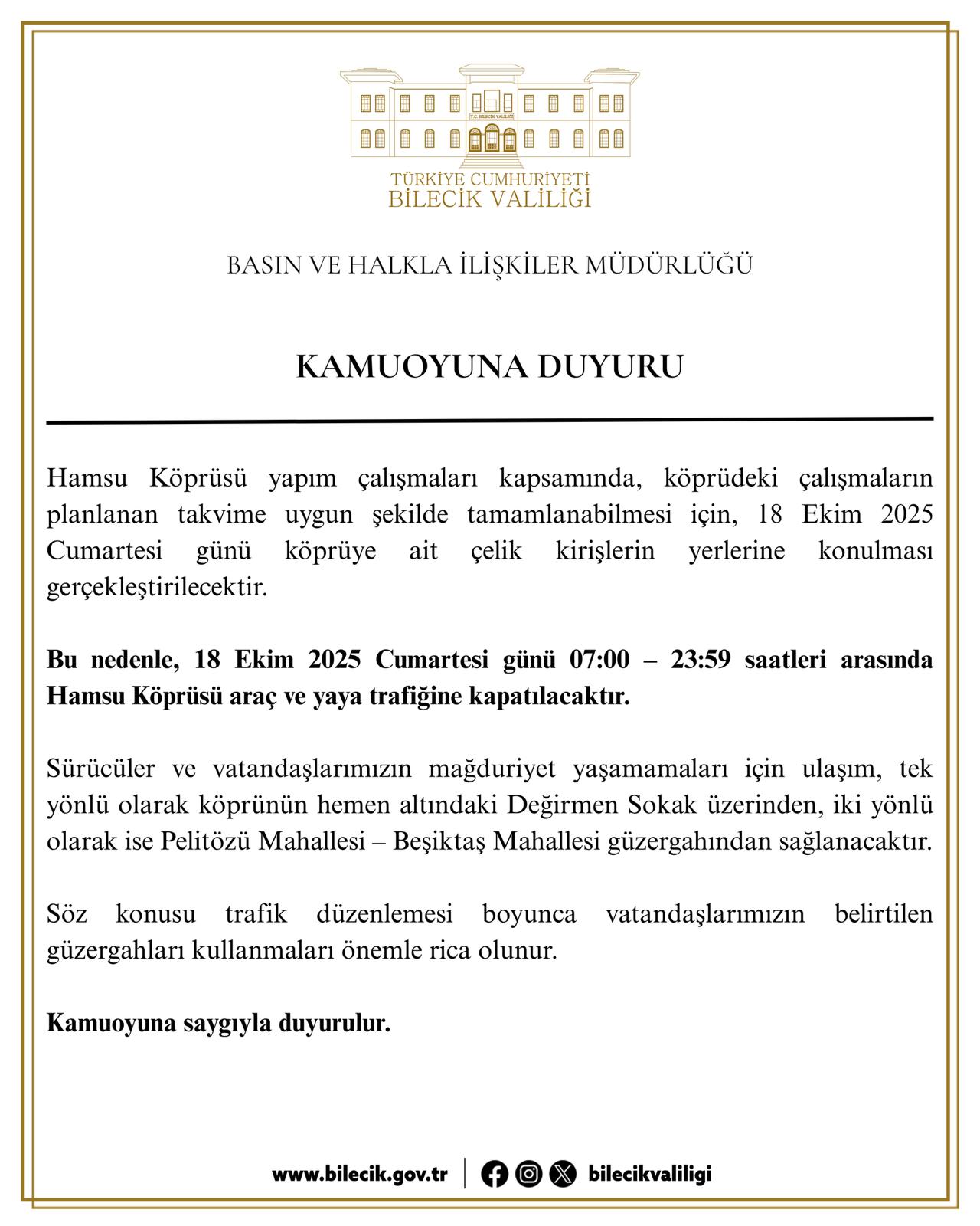 Bu nedenle, 18 Ekim 2025 Cumartesi günü 07:00 – 23:59 saatleri arasında Hamsu Köprüsü araç ve yaya trafiğine kapatılacaktır.