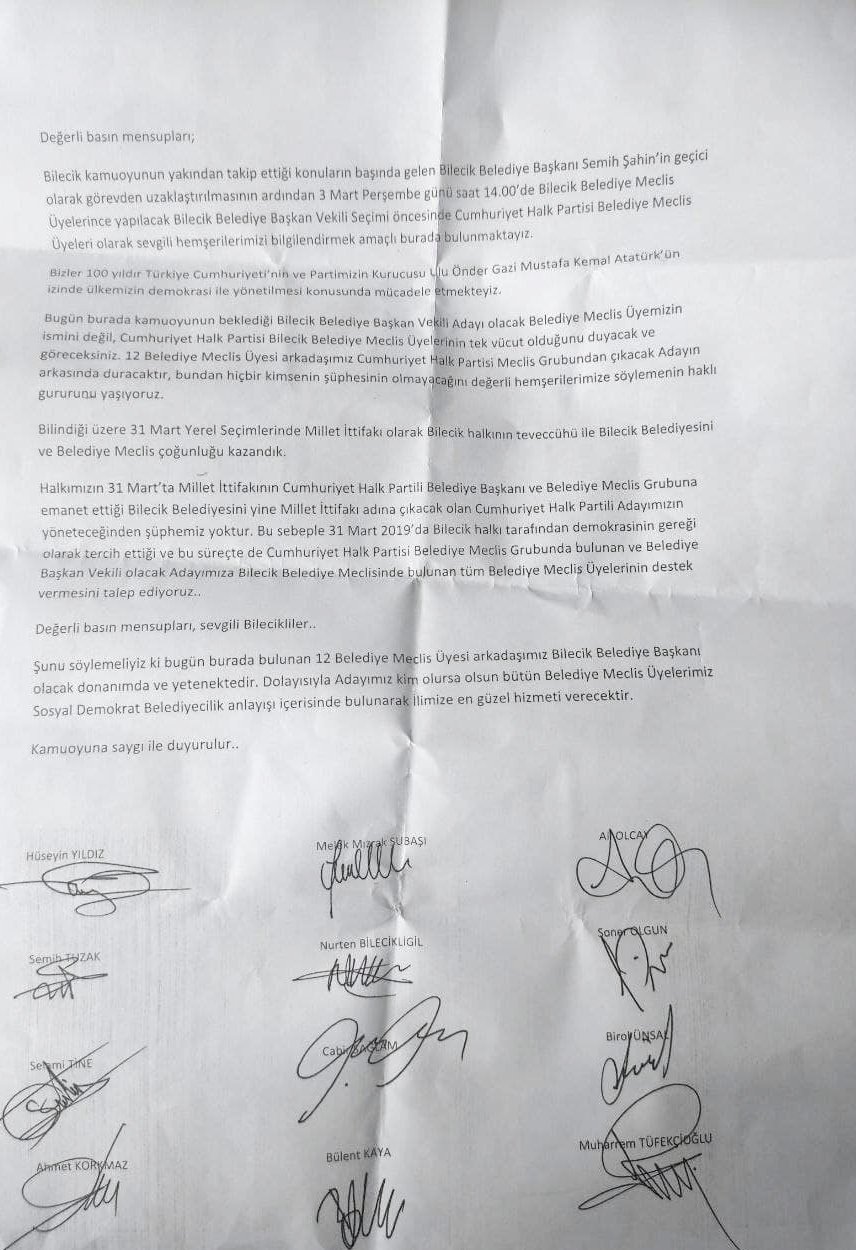 Halkımızın 31 Mart’ta Millet İttifakının Cumhuriyet Halk Partili Belediye Başkanı ve Belediye Meclis Grubuna emanet ettiği Bilecik Belediyesini yine Millet İttifakı adına çıkacak olan Cumhuriyet Halk Partili Adayımızın yöneteceğinden şüphemiz yoktur. Bu sebeple 31 Mart 2019’da Bilecik halkı tarafından demokrasinin gereği olarak tercih ettiği ve bu süreçte de Cumhuriyet Halk Partisi Belediye Meclis Grubunda bulunan ve Belediye Başkan Vekili olacak Adayımıza Bilecik Belediye Meclisinde bulunan tüm Belediye Meclis Üyelerinin destek vermesini talep ediyoruz..