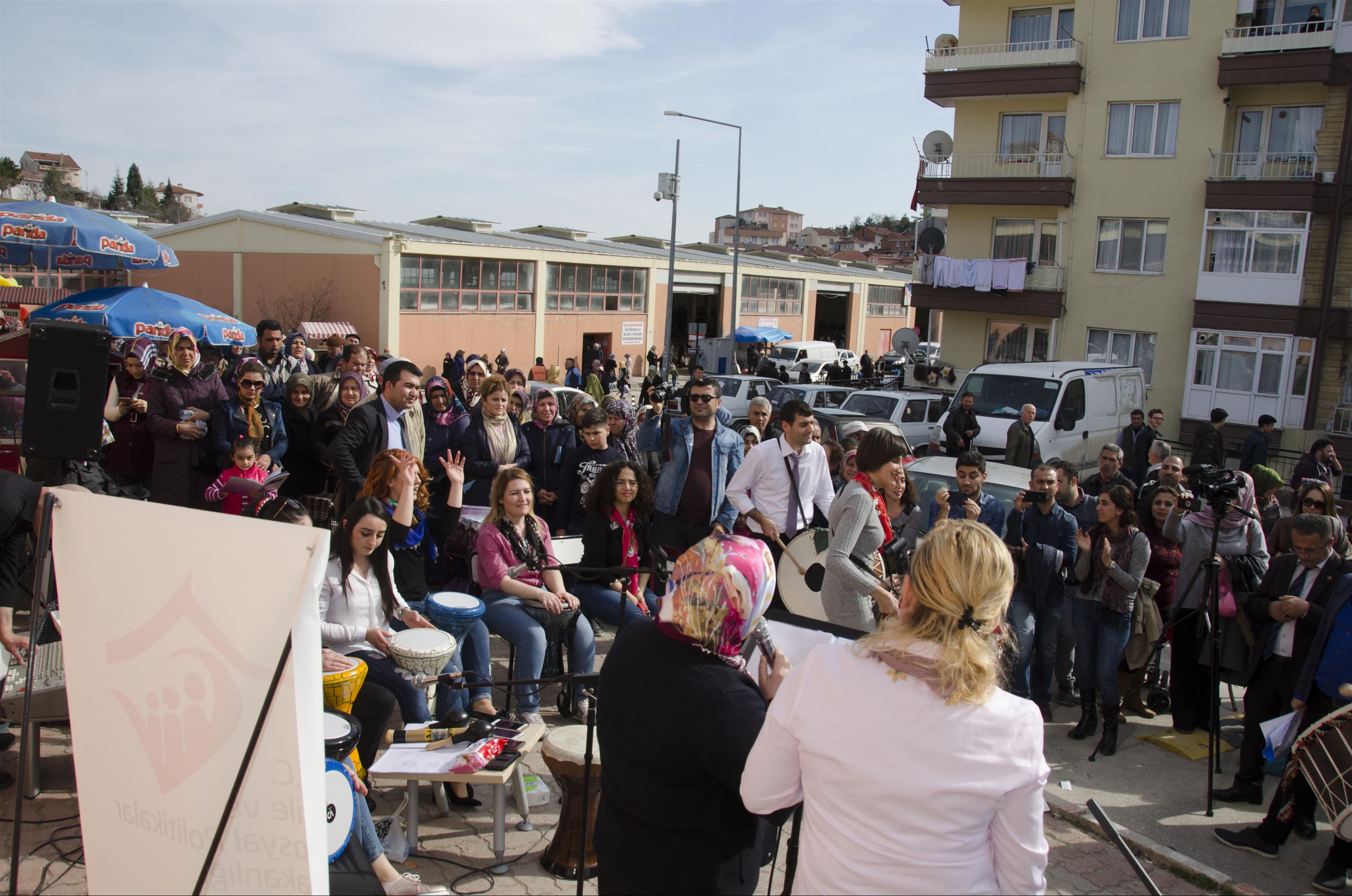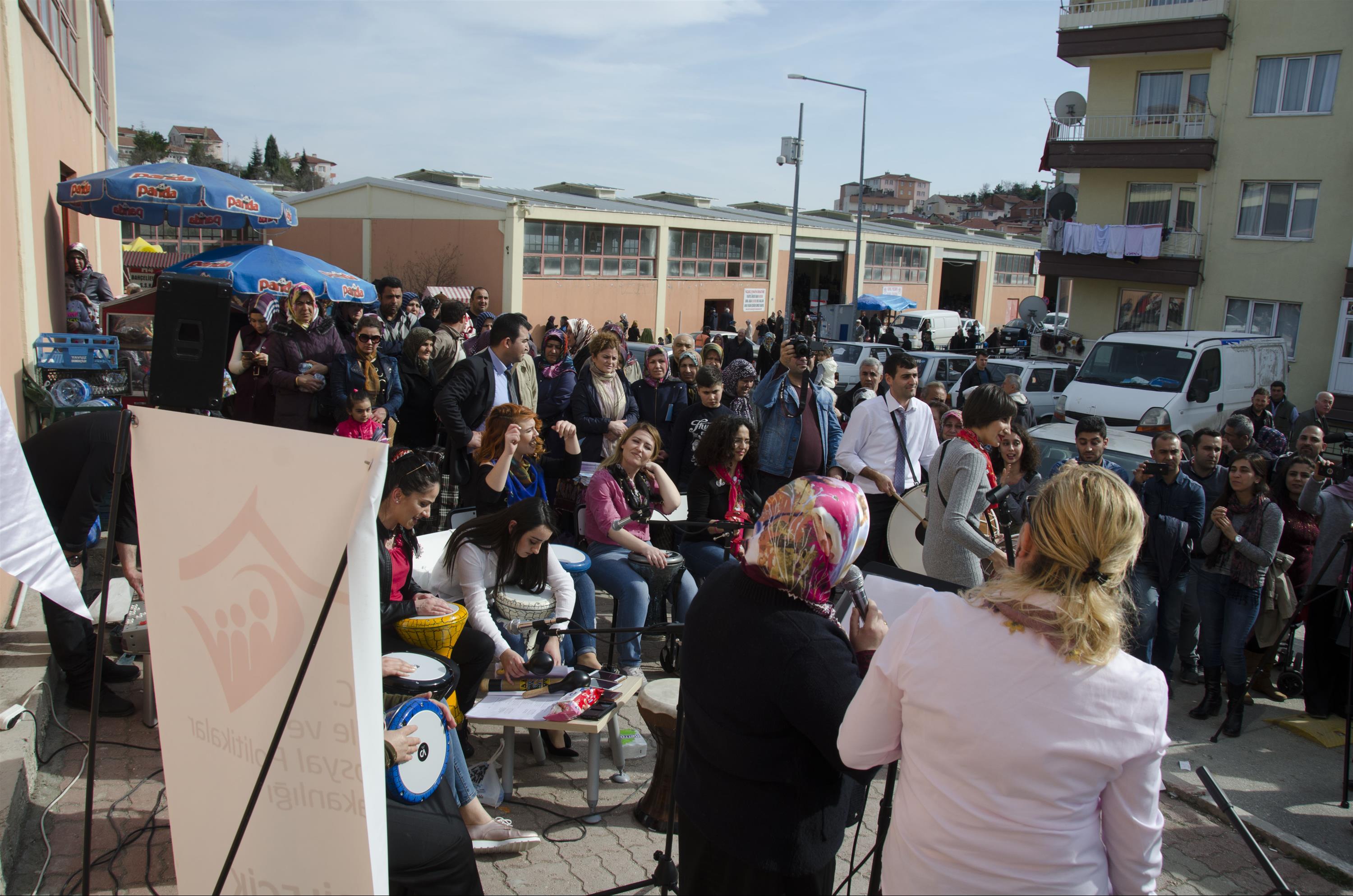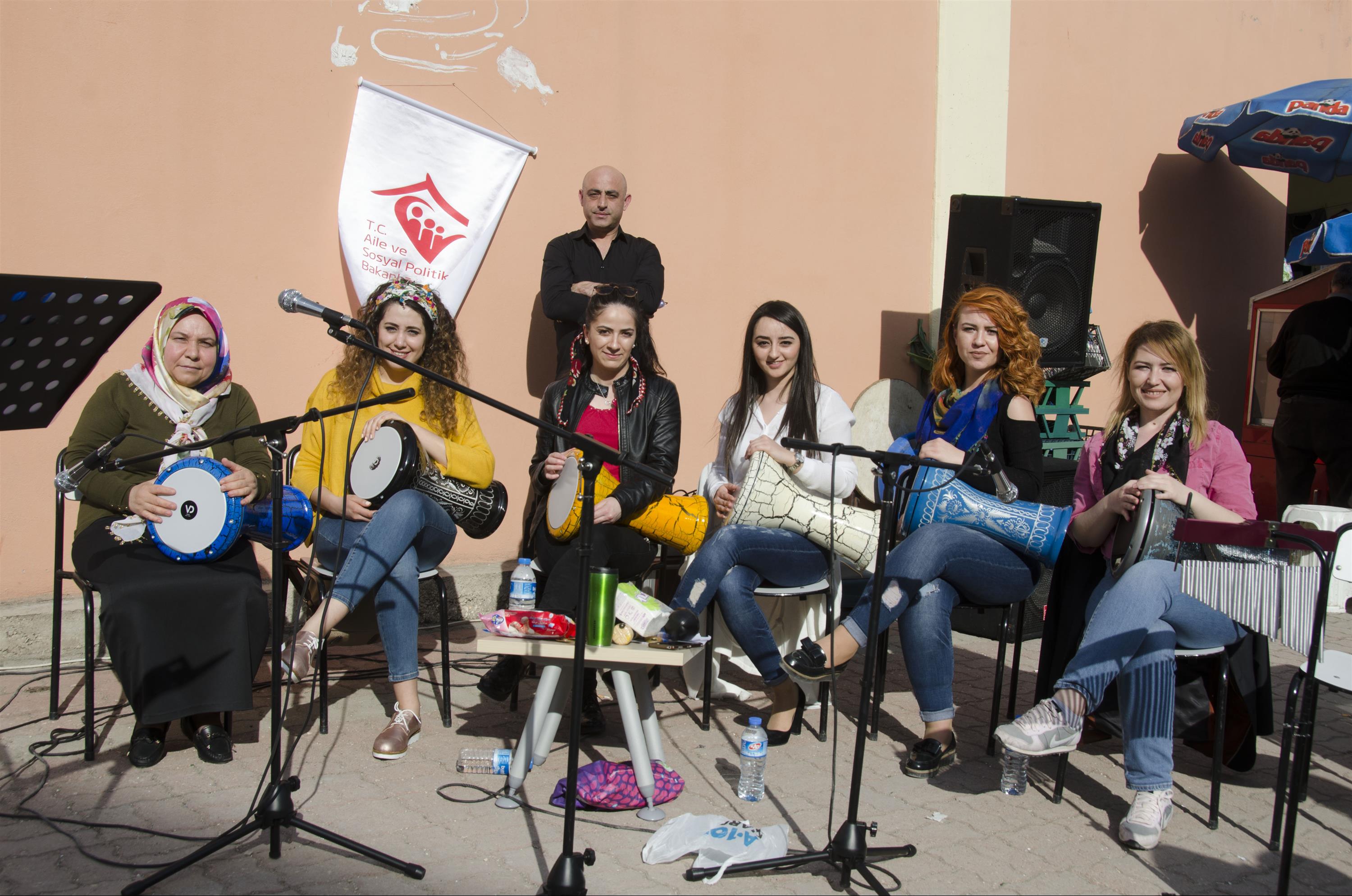 Kapalı Pazar’da Aile ve Sosyal Politikalar İl Müdürlüğü tarafından organize edilen etkinlikte, İl Müdürlüğü personelince oluşturulan ritim grubu, farkındalık oluşturmak amacıyla davul ve darbukalar eşliğinde şarkı söylediler.
