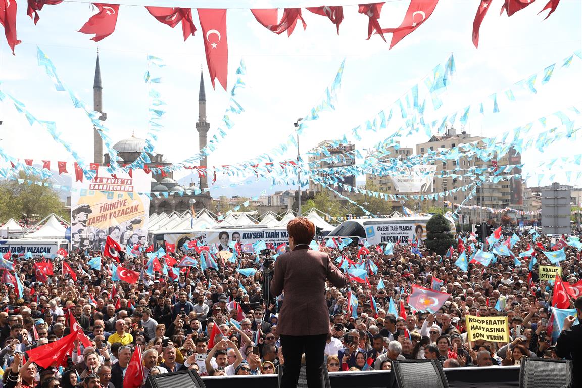 Kayseri’nin sorunlarına değinen ve 14 Mayıs’ın ardından bu sorunları çözeceklerini ifade eden Akşener; ‘’Kooperatif Yasası’nı çıkaracağız. Sizin buradaki 30 bin mağdurun derdini çözeceğiz, Türkiye’deki pek vatandaşın mağduriyetini gidereceğiz. 55 bin kayıtlı işsiz var. Elektrik paralarının yüksekliği sebebiyle tarım göçtü. İlçeler fakirleşti. Peki o zaman ne yapmak gerekiyor? İstihdamı arttırmak gerekiyor. Liyakati öne çekmek gerekiyor.’’ Diyerek köy okullarını yeniden açacaklarını söyledi.