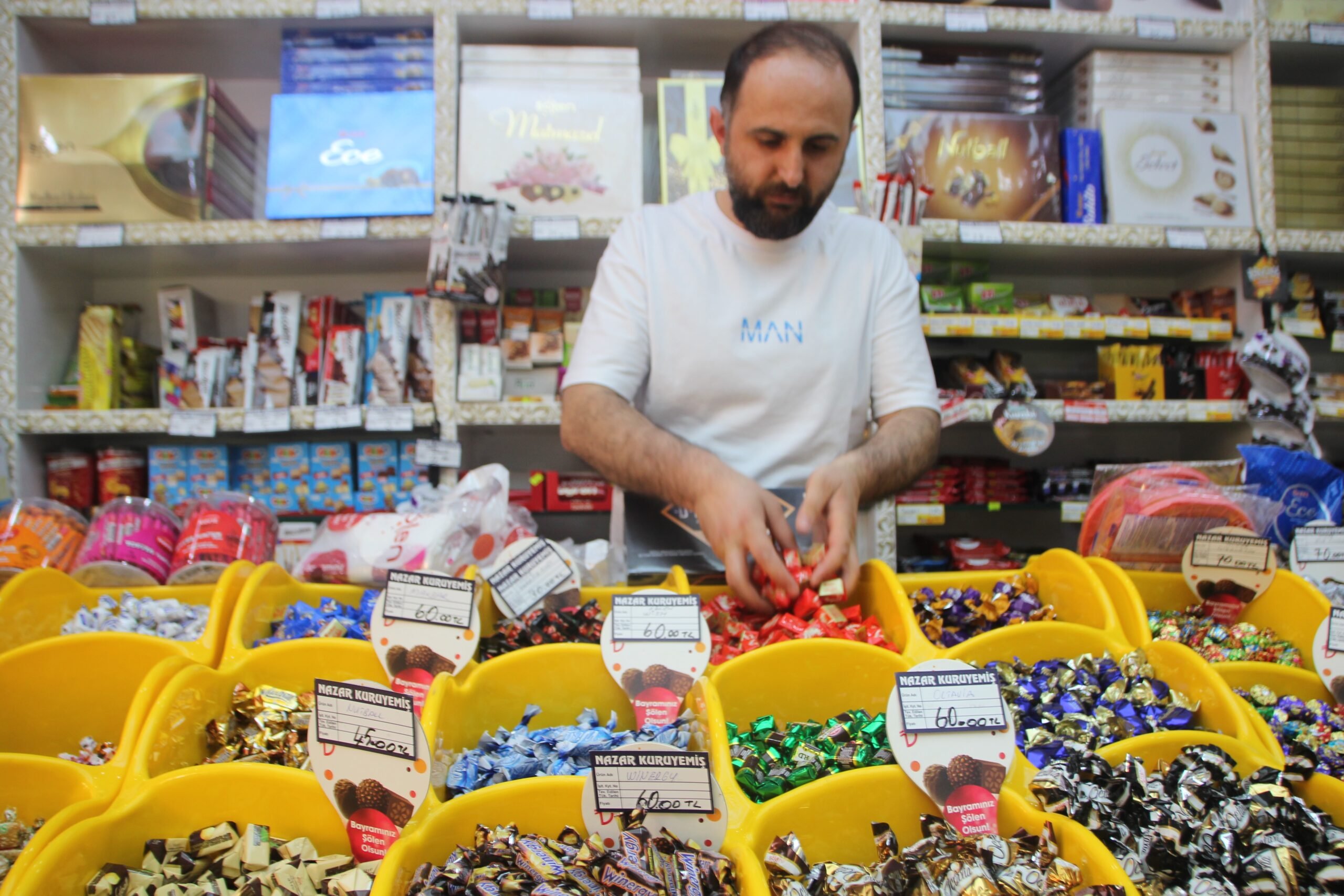 Geçen yıllara göre satışlarının çok daha iyi olduğunu belirten şeker satıcısı İlhan Öztürk, “10 gün öncesinde tezgahımızda bütün çeşitlerimizi sergiledik. Fakat şuanda bir yoğunluk yok. Ama bayramın kısıtlamasız oluşundan dolayı Arife günü bir yoğunluk bekliyoruz. Mutluyuz bu bayram, geçen bayramlar gibi değil. Bir hareketlilik olacağı belli. Stoklarımızı yaptık, depolarımız şuanda çikolata, şekerleme ve lokum, kuruyemiş olarak dolu. İnşallah bayramın bereketli olmasını bekliyoruz. Fiyatlar şeker gruplarında 15 liradan başlıyor 30 liraya kadar kalitesine göre değişiyor. Çikolata da aynı şekilde 25 liradan başlıyor 120-130’a kadar. Çeşitlerimiz çok, hediyelik gruplar da var. Müşterilerimizin en çok talep ettiği ürünler şeker ve çikolatanın yanında sade lokum, güllü lokum, çifte kavrulmuş lokumlar” dedi.