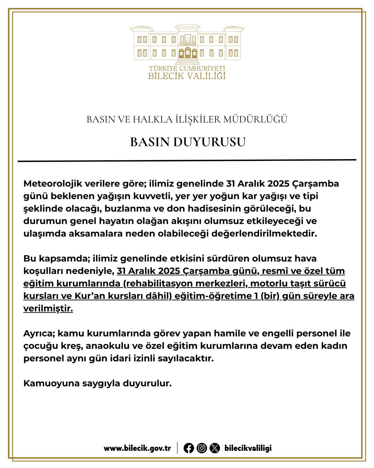 “İlimiz genelinde etkisini sürdüren olumsuz hava koşulları nedeniyle 31 Aralık 2025 Çarşamba günü, rehabilitasyon merkezleri, motorlu taşıt sürücü kursları ve Kur’an kursları dahil resmi ve özel tüm eğitim kurumlarında, eğitim ve öğretime 1 gün süreyle ara verilmiştir. Ayrıca kamu kurumlarında görev yapan hamile ve engelli personel ile çocuğu kreş, anaokulu ve özel eğitim kurumlarına devam eden kadın personel aynı gün idari izinli sayılacaktır.”