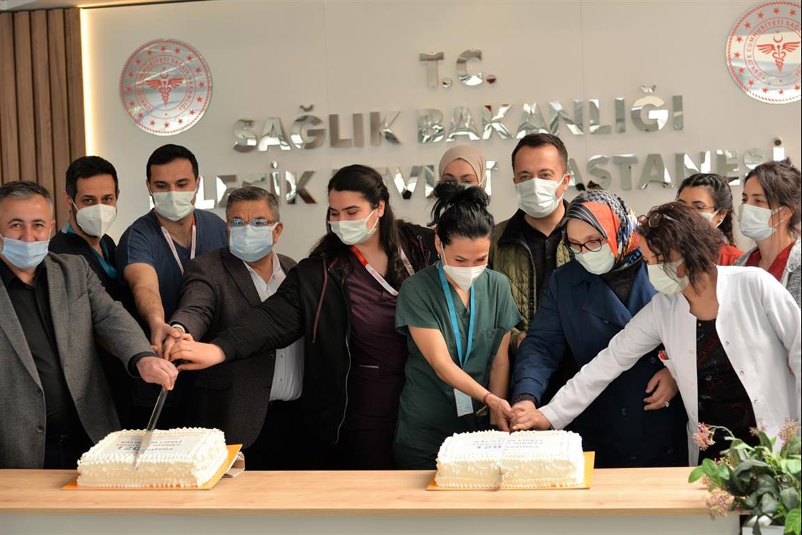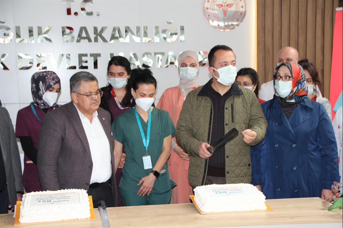 Vali Şentürk ve Milletvekili Yağcı, doktorlarla birlikte ”Tıbbiyeli Hikmet 120. yaşında” ve ”14 Mart Tıp Bayramı” yazılı pastaları kestiler.