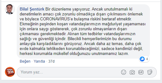 “Bir düzenleme yapıyoruz. Ancak unutulmamalı ki denetimlerin amacı çok zorunlu olmadıkça dışarı çıkılmasını önlemek ve böylece CORONAVİRÜS’e bulaşma riskini bertaraf etmektir. Ekmeğinin peşinden koşan vatandaşlarımızın mağduriyet yaşamaması için onlara saygı göstererek, çok zorunlu olmayanların dışarı çıkmaması gerekmektedir. Alınan tüm tedbirler vatandaşlarımızın sağlığı ve güvenliği içindir. Bilecikli hemşerilerimizin bu durumu anlayışla karşıladıklarını görüyoruz. Ancak daha az temas, daha çok evde kalmakla tehlikeden korunabileceğimizi, sadece kendimizi değil, herkesi korumakla mükellef olduğunuzu unutmamamız lazım.”
