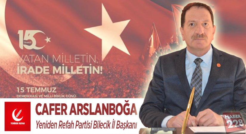 Yeniden Refah Partisi Bilecik İl Başkanı Cafer Arslanboğa’nın 15 Temuz Mesajı Uğur Baklacı tarafından yayınlandı 15 Temmuz 2021, 00:05 yayınlandı + - Paylaş Bu Yazıyı Paylaş veya linki kopyala Kopyala Yeniden Refah Partisi Bilecik İl Başkanı Cafer Arslanboğa’nın 15 Temuz Mesajı Yorum Yap Paylaş